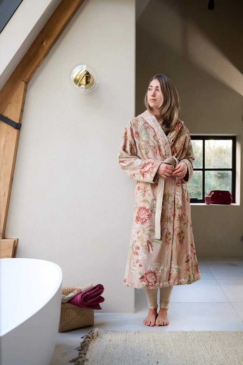 De luxe badstofcollectie Secret Garden van Pip Studio geeft je badkamer een verrassend kleuraccent. Op de badjas staan grote kleurrijke pioenrozen afgewisseld met fantasievolle bloemen, bladeren, bramen en bessentrossen. Tussen de bloemen zitten paradijsvogels. De badjas heeft een capuchon, steekzakken en sluit met een lange ceintuur. Combineer de badjas met de andere badstofcollecties van Pip Studio voor het ultieme mix&match effect. De badjas moet voor gebruik gewassen worden volgens het label.