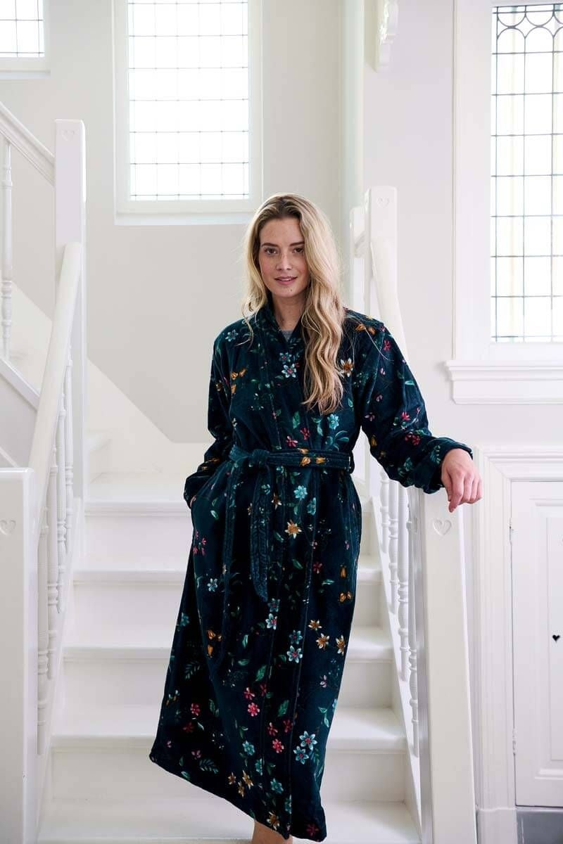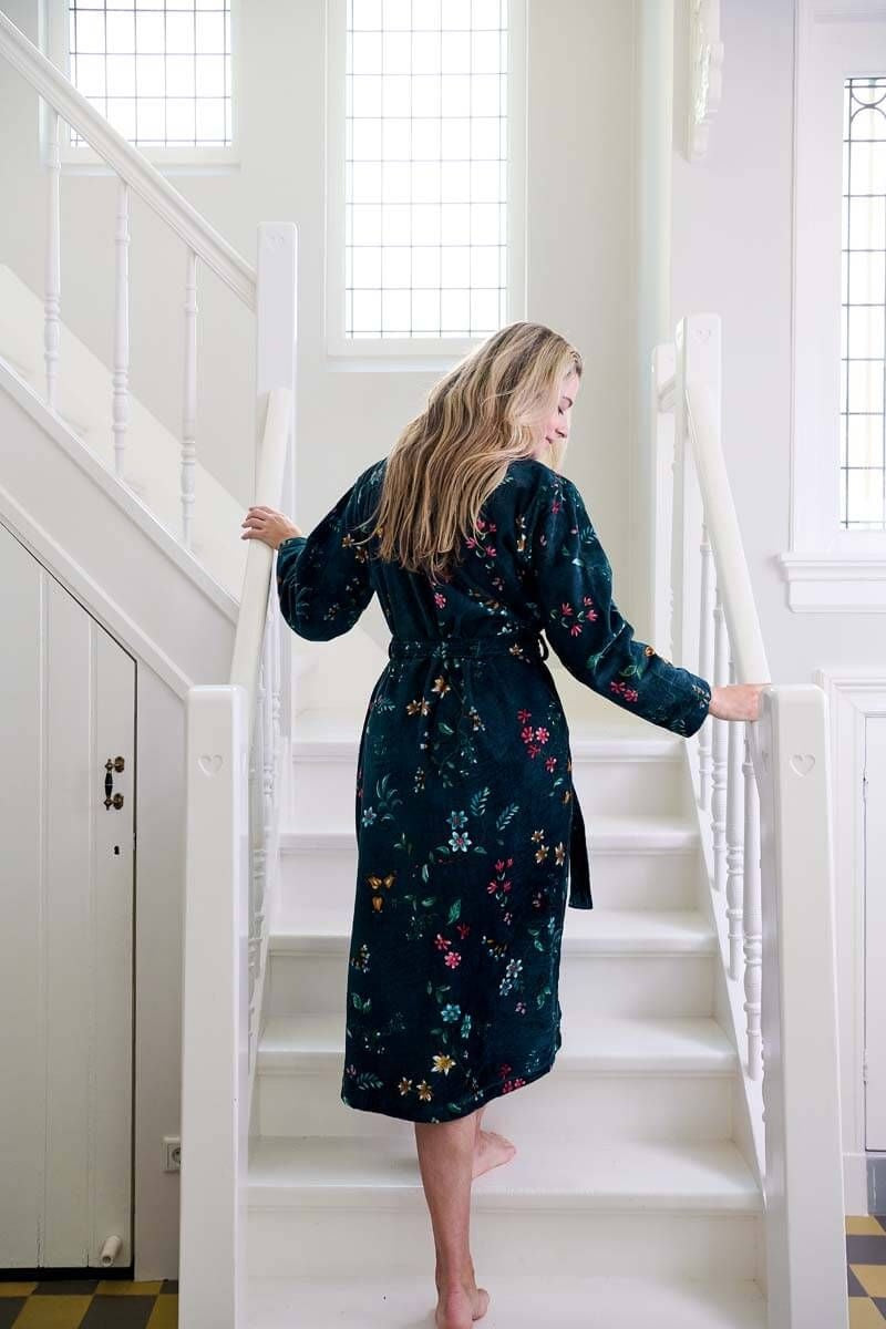 Wikkel jezelf in deze donkerblauwe Les Fleurs badjas met kleine gedecoreerde fantasiebloemen. Deze Les Fleurs badjas is fijn om te dragen in de ochtend, maar ook heerlijk om de dag mee af te sluiten. De binnenkant van de badjas heeft een effen kleur. De badjas heeft een mooi aansluitende doorgestikte kraag, steekzakken en sluit je met een lang ceintuur. De Les Fleurs badjas past goed bij andere items uit de collectie, waardoor er een leuk mix & match effect onstaat in je badkamer. De Les Fleurs badjas is gemaakt van 100% hoogwaardige katoen terry velours met een kwaliteit van 380 gr/m2. Hierdoor voelt de badjas super zacht en stevig aan. Door het hoogwaardige materiaal heeft uitstekende vochtabsorberende, ademende en sneldrogende kwaliteiten. Een badjas om verliefd op te worden!