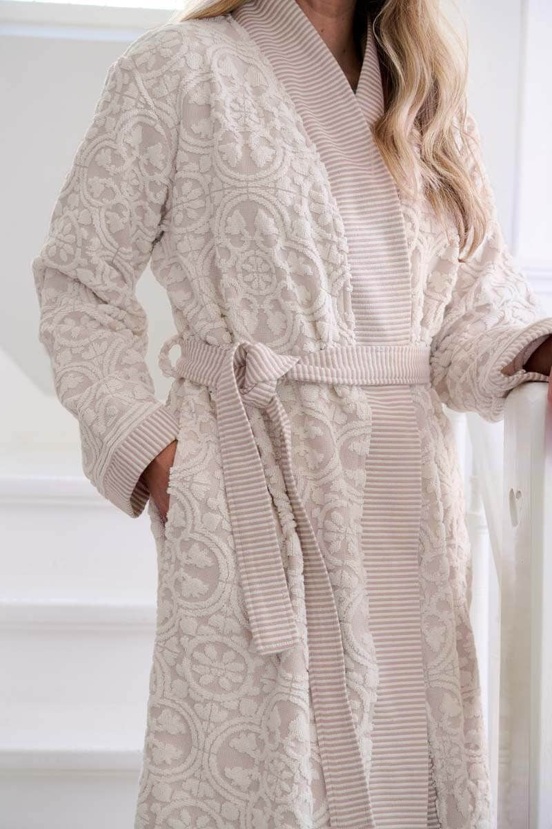 Deze khaki Tile de Pip badjas is fijn om te dragen in de ochtend, maar ook heerlijk om de dag mee af te sluiten. Gedecoreerd met een tonaal ingeweven tegelmotief met hoog-laag effect. De badjas heeft een mooi aansluitende doorgestikte kraag, steekzakken en sluit je met een lang ceintuur. De badjas is gemaakt van 100% hoogwaardige katoen terry velours met een kwaliteit van 380 gr/m2.