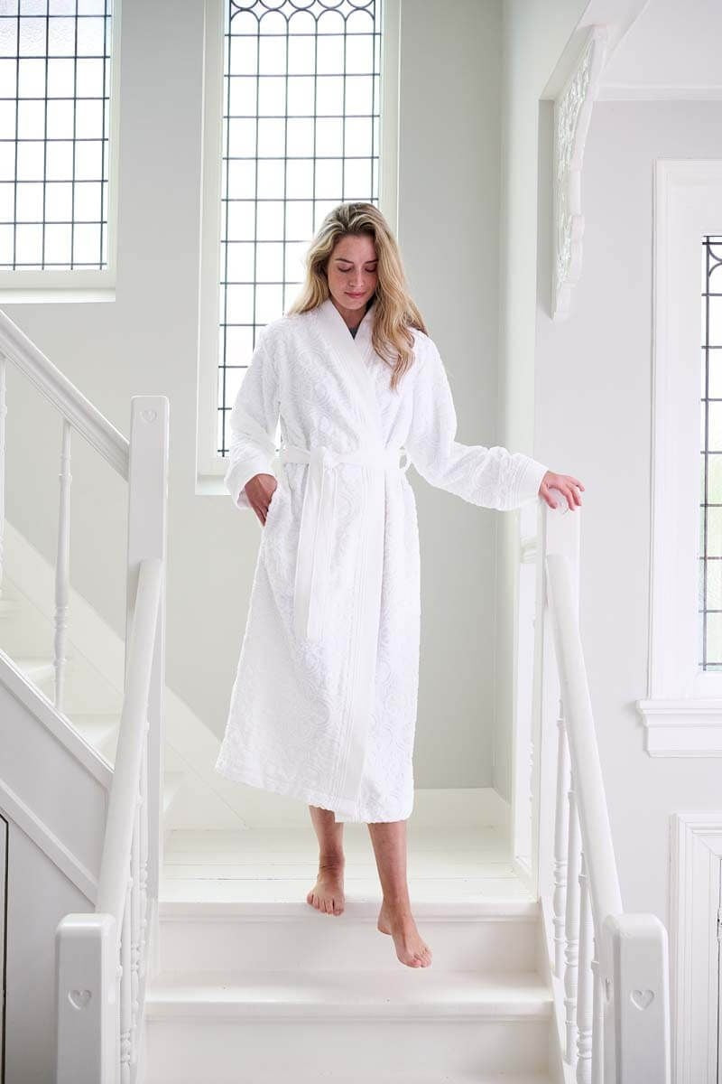 Deze witte Mosaic de Pip badjas is fijn om te dragen in de ochtend, maar ook heerlijk om de dag mee af te sluiten. Gedecoreerd met een tonaal ingeweven tegelmotief met hoog-laag effect. De badjas heeft een mooi aansluitende doorgestikte kraag, steekzakken en sluit je met een lang ceintuur. De badjas is gemaakt van 100% hoogwaardige katoen terry velours met een kwaliteit van 380 gr/m2.